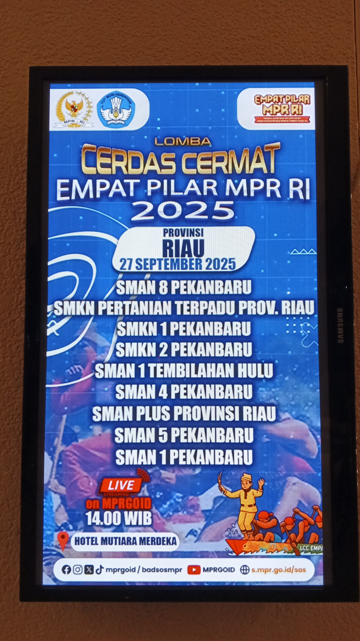 Pekanbaru, riau21.net – SMA Negeri Plus Provinsi Riau menunjukkan prestasi gemilang dalam Lomba Cerdas Cermat 4 Pilar MPR RI yang diadakan di Hotel Mutiara Jln.DI.Panjaitan Pekanbaru. Dalam kompetisi yang diikuti oleh 9 sekolah unggulan di Provinsi Riau ini, SMA Negeri Plus Provinsi Riau berhasil meraih juara kedua. Sabtu (27/9/2025).