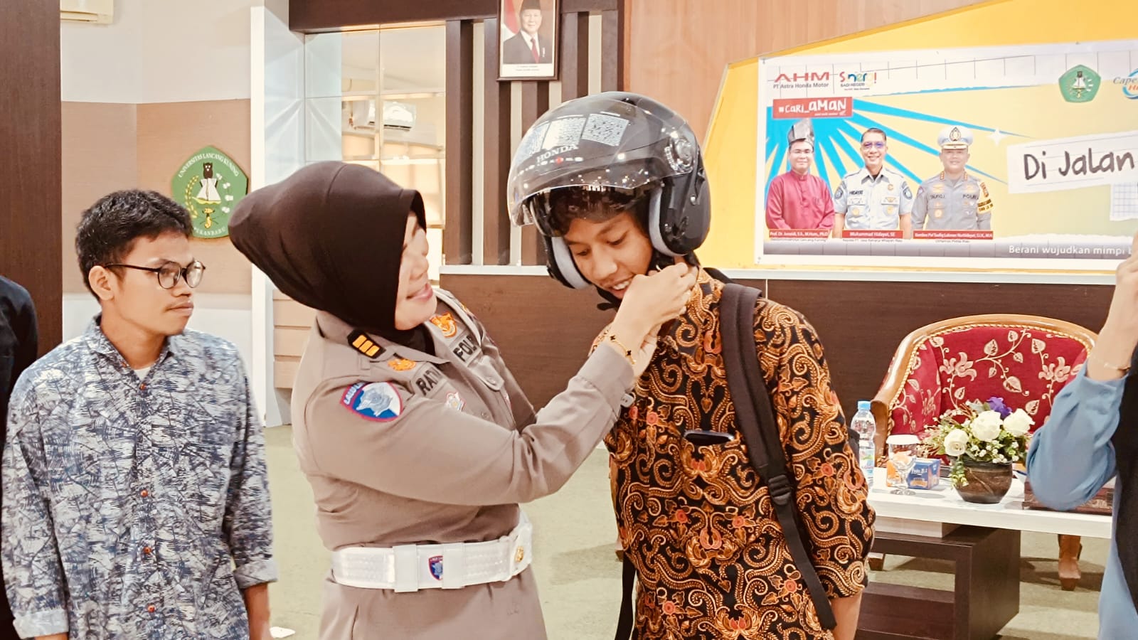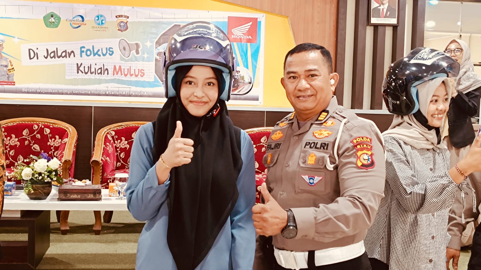 Sebagai bentuk kepedulian, Ditlantas Polda Riau turut menyerahkan helm, buku panduan keselamatan, serta bibit pohon kepada mahasiswa.