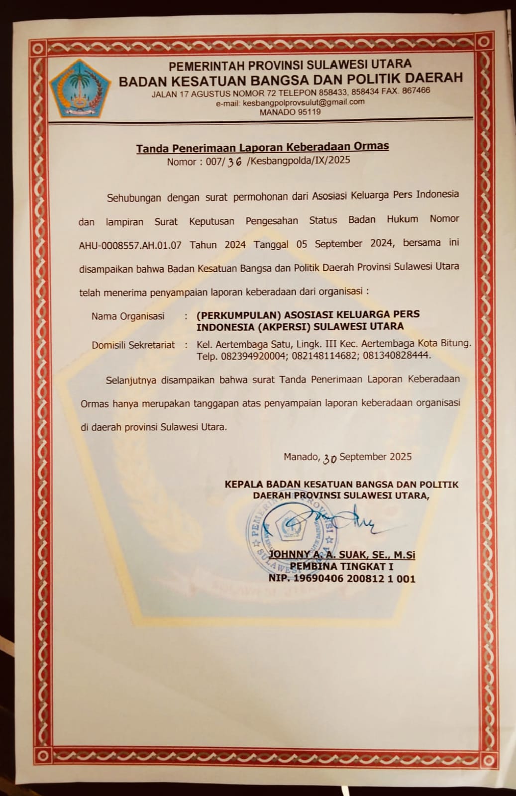 Sulut, riau21.net – Dengan segala upaya, dan juga usaha kerja keras bersama Tim Asosiasi Keluarga Pers Indonesia (Akpersi) telah resmi terdaftar di Badan Kesatuan Bangsa Dan Politik Daerah Provinsi Sulawesi Utara, Tim Akpersi mengambil surat resmi kamis (9/10/2025).