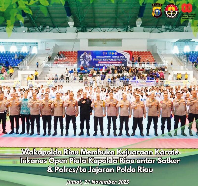 Pekanbaru,  riau21.netKejuaraan Karate Inkanas Open Piala Kapolda Riau yang melibatkan antar Satker Polres dan Polresta, Jajaran Polda Riau serta antar Dojo Inkanas se Provinsi Riau, resmi dibuka pada Jumat pagi (21/11) pukul 07.30 WIB. Kejuaraan ini resmi dibuka oleh Wakapolda Riau, Brigjen Pol Jossy Kusumo yang didampingi oleh sejumlah pejabat utama ( PJU) Polda Riau. Acara pembukaan berlangsung di GOR Gelanggang Remaja, Jl. Jend. Sudirman Pekanbaru, pelaksanaan dari tanggal 21 s.d. 22 November 2025. Dalam sambutannya, Wakapolda Riau mengungkapkan rasa terima kasih dan apresiasi kepada panitia penyelenggara, para pelatih, serta seluruh atlet yang hadir dalam kejuaraan ini. Ia juga memberikan pesan khusus kepada para peserta untuk selalu bertanding dengan sportifitas tinggi, menjunjung etika dan kehormatan dalam setiap laga.