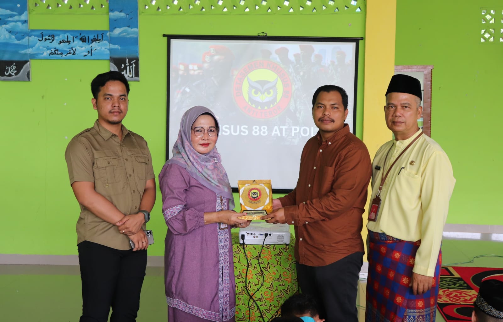 Personil Satgaswil Riau Densus 88 Anti Teror Polri, Briptu Riduan S.H., dan Bripda Daniel Leo Fransisco Sianturi, memberikan pemaparan tentang pencegahan IRET kepada pelajar.